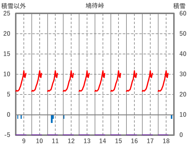 | 日 | 時 | 気温 | 降水 | 風向/風速 | 日照 | 積雪 | 降雪 |