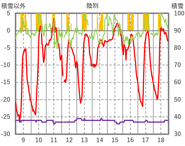 | 日 | 時 | 気温 | 降水 | 風向/風速 | 日照 | 積雪 | 降雪 |