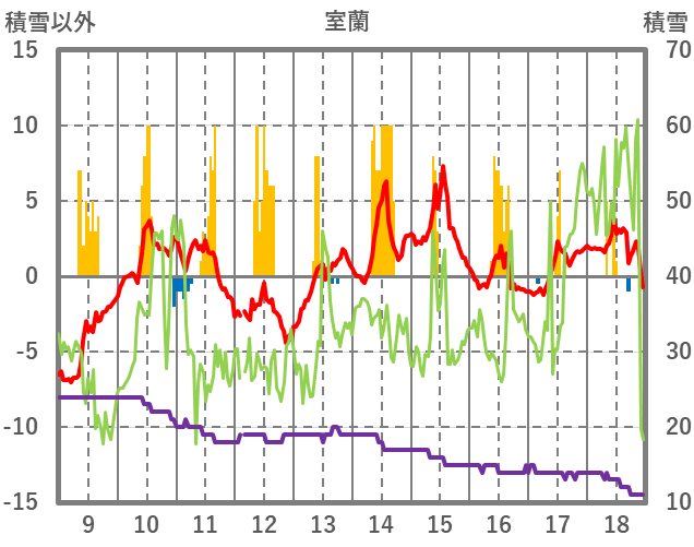 | 日 | 時 | 気温 | 降水 | 風向/風速 | 日照 | 積雪 | 降雪 |