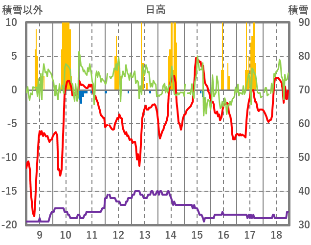 | 日 | 時 | 気温 | 降水 | 風向/風速 | 日照 | 積雪 | 降雪 |