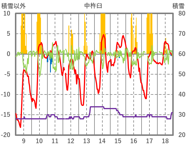 | 日 | 時 | 気温 | 降水 | 風向/風速 | 日照 | 積雪 | 降雪 |