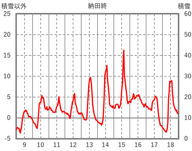 | 日 | 時 | 気温 | 降水 | 風向/風速 | 日照 | 積雪 | 降雪 |