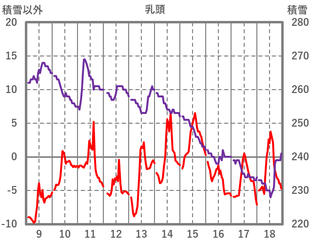 | 日 | 時 | 気温 | 降水 | 風向/風速 | 日照 | 積雪 | 降雪 |