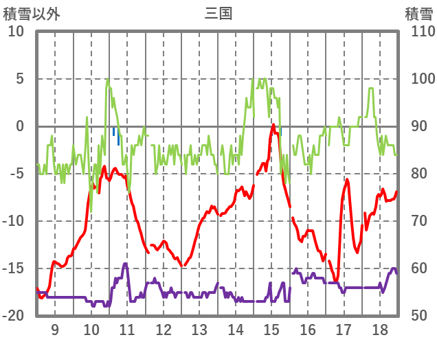 | 日 | 時 | 気温 | 降水 | 風向/風速 | 日照 | 積雪 | 降雪 |