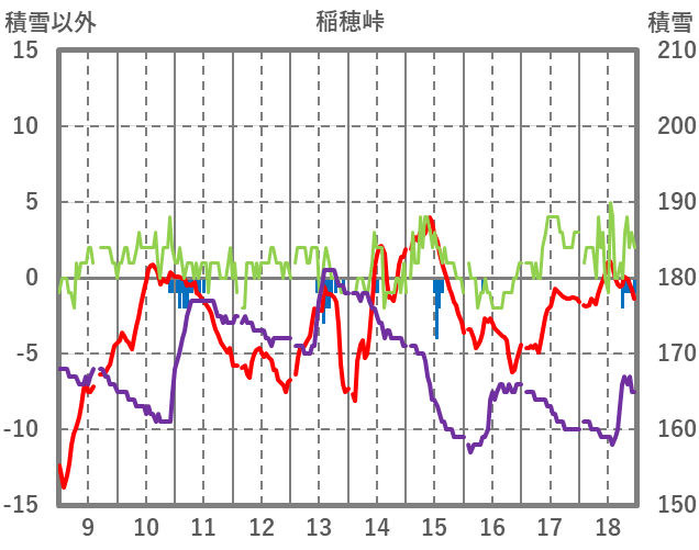 | 日 | 時 | 気温 | 降水 | 風向/風速 | 日照 | 積雪 | 降雪 |