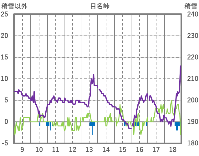 | 日 | 時 | 気温 | 降水 | 風向/風速 | 日照 | 積雪 | 降雪 |