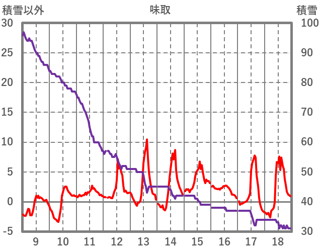 | 日 | 時 | 気温 | 降水 | 風向/風速 | 日照 | 積雪 | 降雪 |