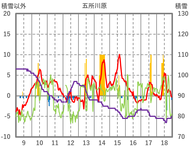 | 日 | 時 | 気温 | 降水 | 風向/風速 | 日照 | 積雪 | 降雪 |