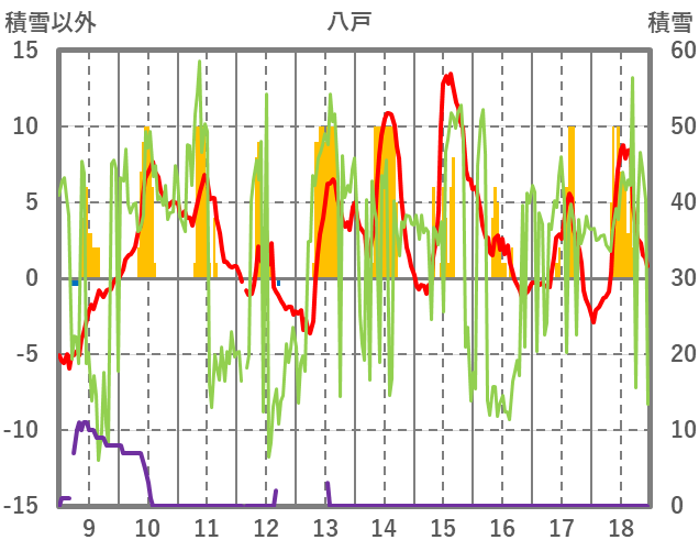 | 日 | 時 | 気温 | 降水 | 風向/風速 | 日照 | 積雪 | 降雪 |