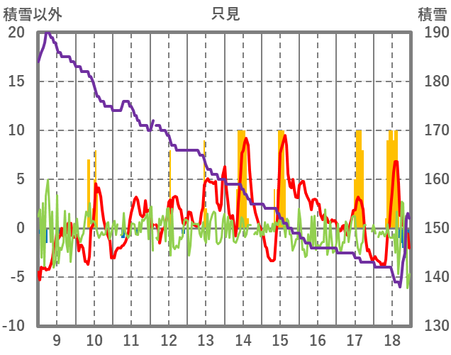 | 日 | 時 | 気温 | 降水 | 風向/風速 | 日照 | 積雪 | 降雪 |
