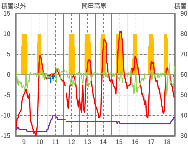 | 日 | 時 | 気温 | 降水 | 風向/風速 | 日照 | 積雪 | 降雪 |