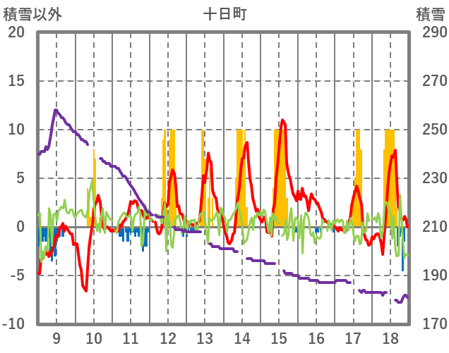 | 日 | 時 | 気温 | 降水 | 風向/風速 | 日照 | 積雪 | 降雪 |