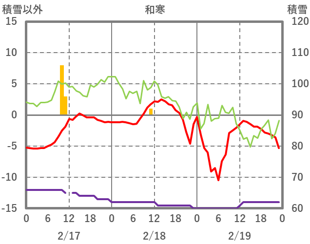 | 日 | 時 | 気温 | 降水 | 風向/風速 | 日照 | 積雪 | 降雪 |