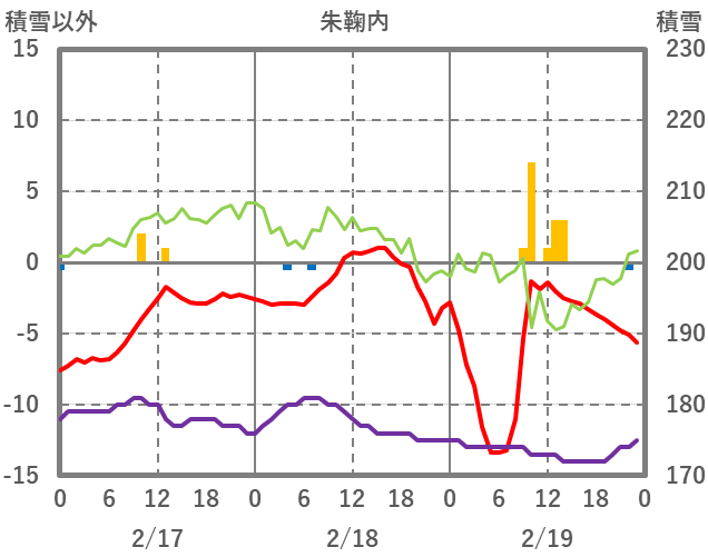 | 日 | 時 | 気温 | 降水 | 風向/風速 | 日照 | 積雪 | 降雪 |