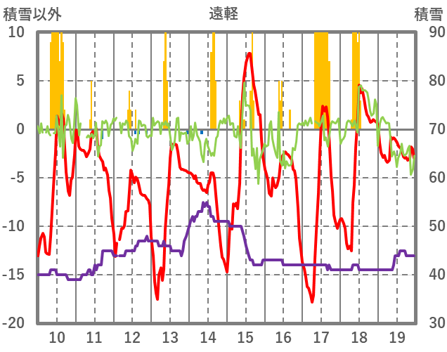 | 日 | 時 | 気温 | 降水 | 風向/風速 | 日照 | 積雪 | 降雪 |