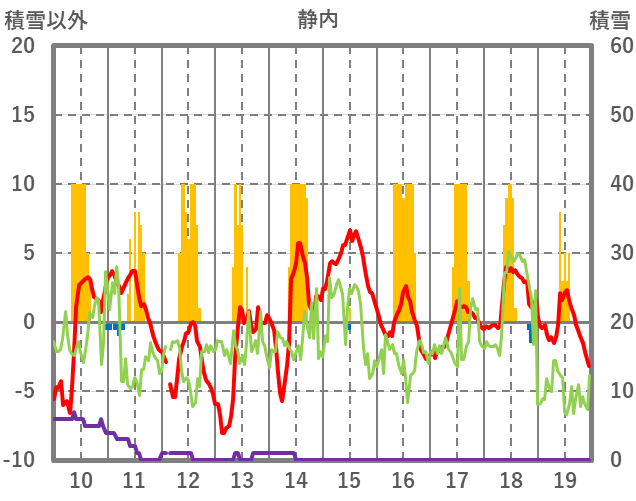 | 日 | 時 | 気温 | 降水 | 風向/風速 | 日照 | 積雪 | 降雪 |