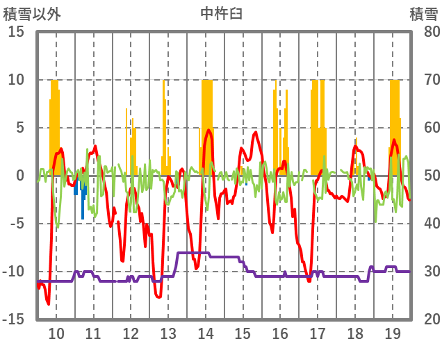 | 日 | 時 | 気温 | 降水 | 風向/風速 | 日照 | 積雪 | 降雪 |