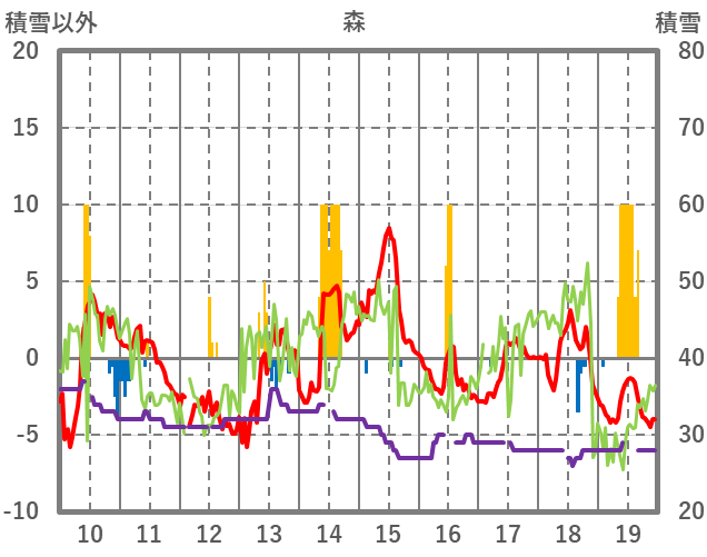 | 日 | 時 | 気温 | 降水 | 風向/風速 | 日照 | 積雪 | 降雪 |