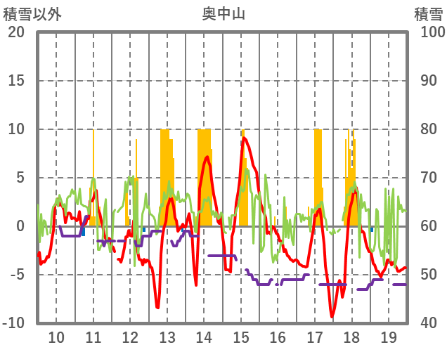| 日 | 時 | 気温 | 降水 | 風向/風速 | 日照 | 積雪 | 降雪 |