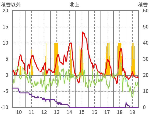 | 日 | 時 | 気温 | 降水 | 風向/風速 | 日照 | 積雪 | 降雪 |