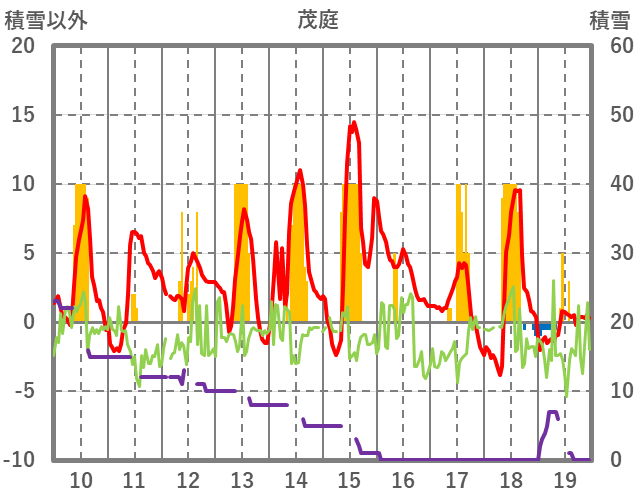 | 日 | 時 | 気温 | 降水 | 風向/風速 | 日照 | 積雪 | 降雪 |