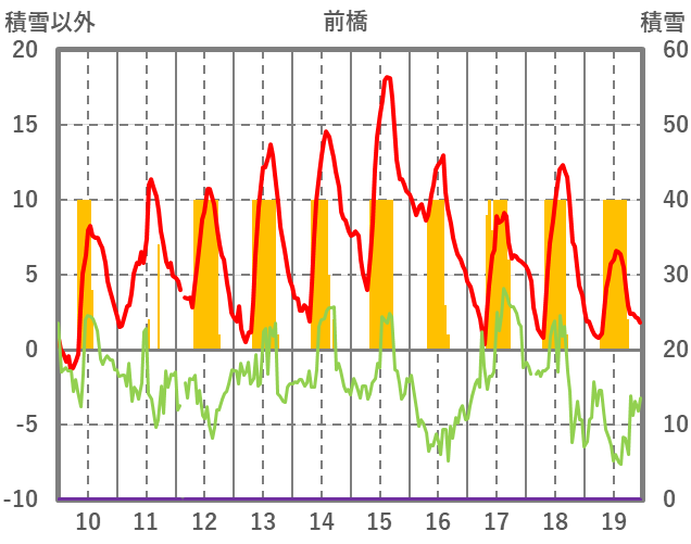 | 日 | 時 | 気温 | 降水 | 風向/風速 | 日照 | 積雪 | 降雪 |