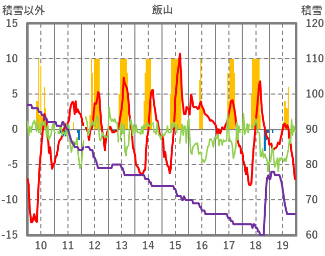 | 日 | 時 | 気温 | 降水 | 風向/風速 | 日照 | 積雪 | 降雪 |
