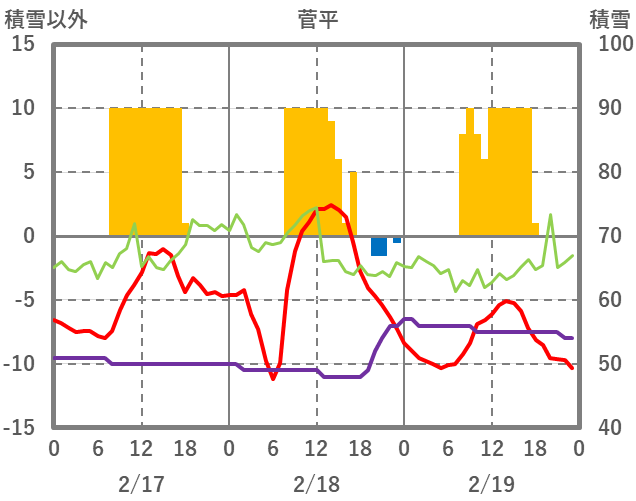 | 日 | 時 | 気温 | 降水 | 風向/風速 | 日照 | 積雪 | 降雪 |