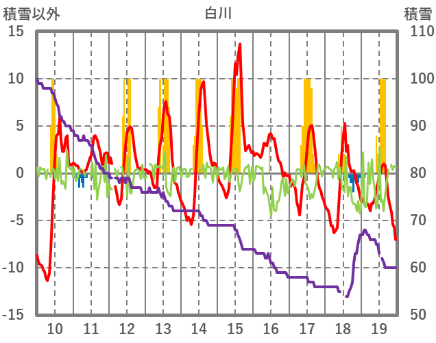 | 日 | 時 | 気温 | 降水 | 風向/風速 | 日照 | 積雪 | 降雪 |