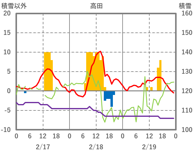 | 日 | 時 | 気温 | 降水 | 風向/風速 | 日照 | 積雪 | 降雪 |