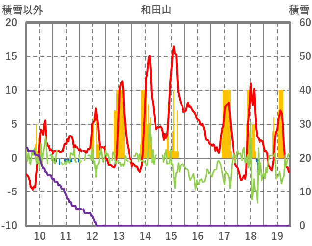 | 日 | 時 | 気温 | 降水 | 風向/風速 | 日照 | 積雪 | 降雪 |