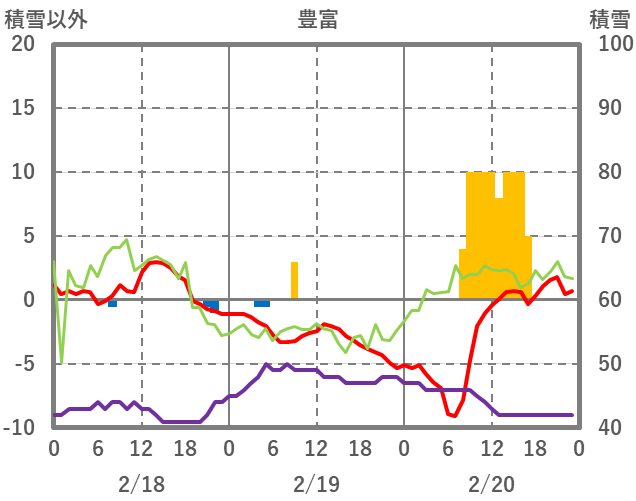 | 日 | 時 | 気温 | 降水 | 風向/風速 | 日照 | 積雪 | 降雪 |