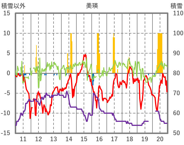 | 日 | 時 | 気温 | 降水 | 風向/風速 | 日照 | 積雪 | 降雪 |