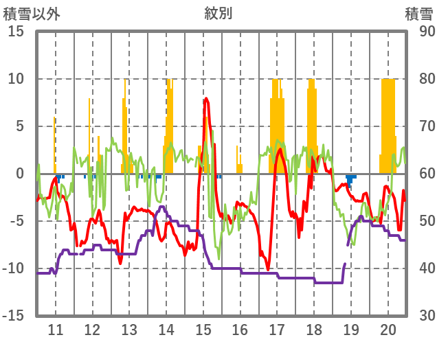 | 日 | 時 | 気温 | 降水 | 風向/風速 | 日照 | 積雪 | 降雪 |