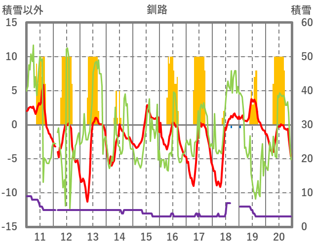 | 日 | 時 | 気温 | 降水 | 風向/風速 | 日照 | 積雪 | 降雪 |