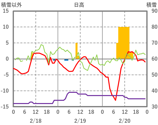 | 日 | 時 | 気温 | 降水 | 風向/風速 | 日照 | 積雪 | 降雪 |