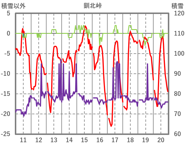 | 日 | 時 | 気温 | 降水 | 風向/風速 | 日照 | 積雪 | 降雪 |