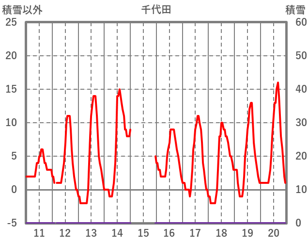 | 日 | 時 | 気温 | 降水 | 風向/風速 | 日照 | 積雪 | 降雪 |