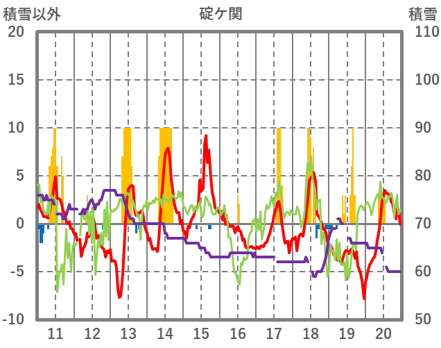 | 日 | 時 | 気温 | 降水 | 風向/風速 | 日照 | 積雪 | 降雪 |
