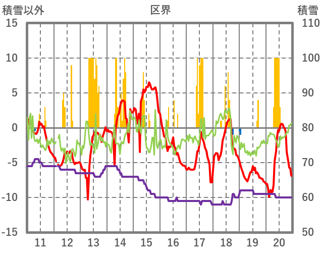 | 日 | 時 | 気温 | 降水 | 風向/風速 | 日照 | 積雪 | 降雪 |