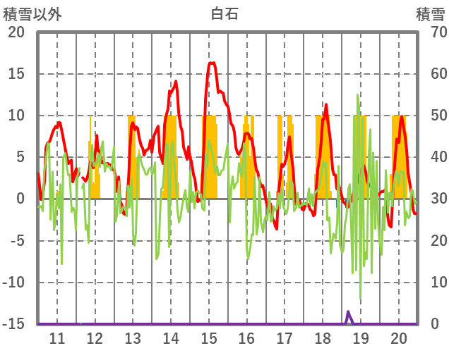 | 日 | 時 | 気温 | 降水 | 風向/風速 | 日照 | 積雪 | 降雪 |