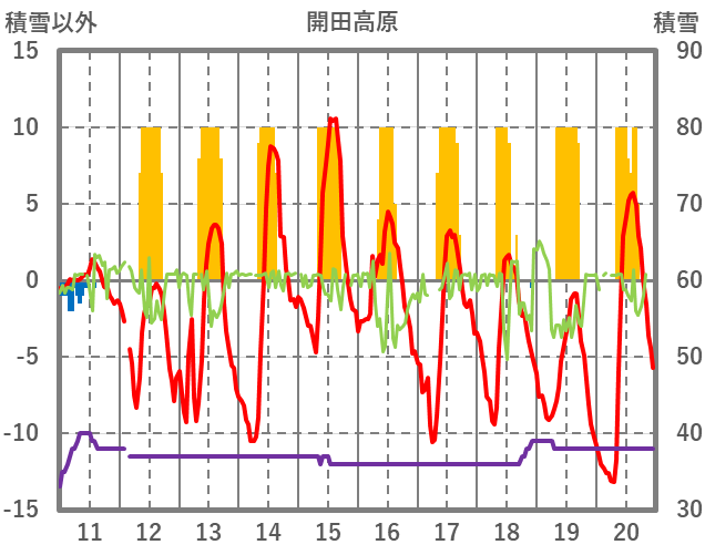 | 日 | 時 | 気温 | 降水 | 風向/風速 | 日照 | 積雪 | 降雪 |