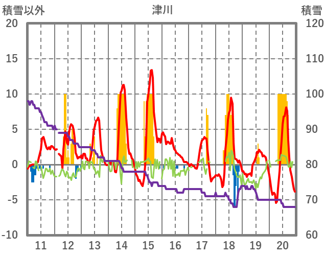 | 日 | 時 | 気温 | 降水 | 風向/風速 | 日照 | 積雪 | 降雪 |