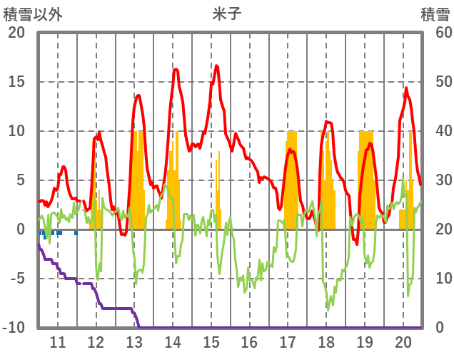 | 日 | 時 | 気温 | 降水 | 風向/風速 | 日照 | 積雪 | 降雪 |