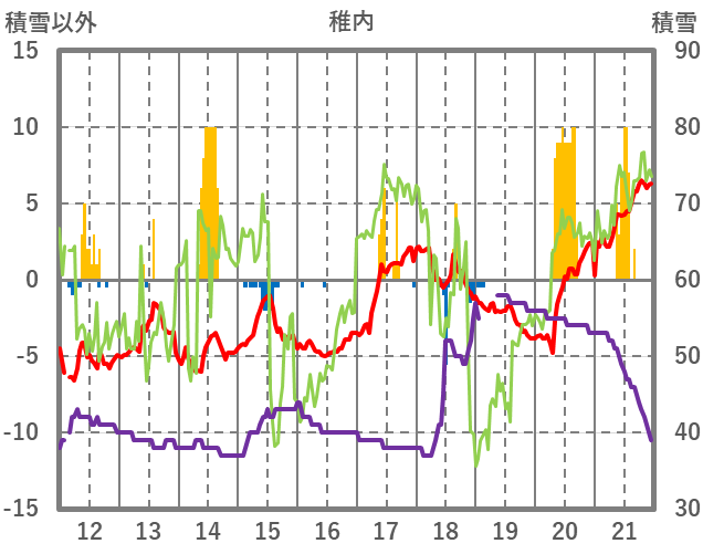 | 日 | 時 | 気温 | 降水 | 風向/風速 | 日照 | 積雪 | 降雪 |
