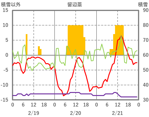 | 日 | 時 | 気温 | 降水 | 風向/風速 | 日照 | 積雪 | 降雪 |