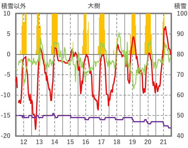 | 日 | 時 | 気温 | 降水 | 風向/風速 | 日照 | 積雪 | 降雪 |