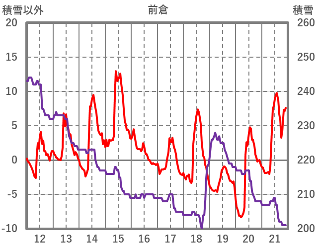 | 日 | 時 | 気温 | 降水 | 風向/風速 | 日照 | 積雪 | 降雪 |