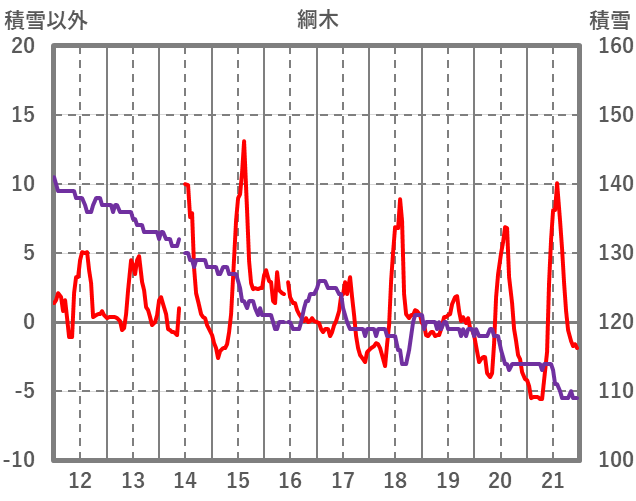| 日 | 時 | 気温 | 降水 | 風向/風速 | 日照 | 積雪 | 降雪 |