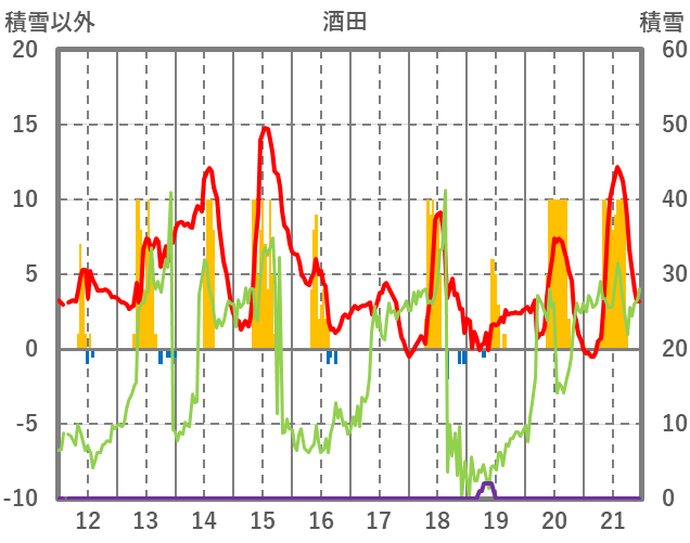 | 日 | 時 | 気温 | 降水 | 風向/風速 | 日照 | 積雪 | 降雪 |